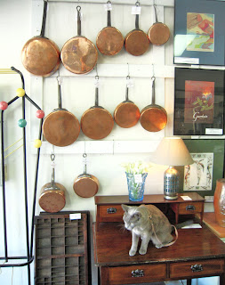 We started to bring out the vintage copper pots and pans this week, and the wall where I hang it all is looking spiffy, with more to come. Doug has seized several choice pieces, so a lovely lidded casserole pot and a big preserving pan will now apparently be staying at our house, but there are still plenty of good pieces to come.